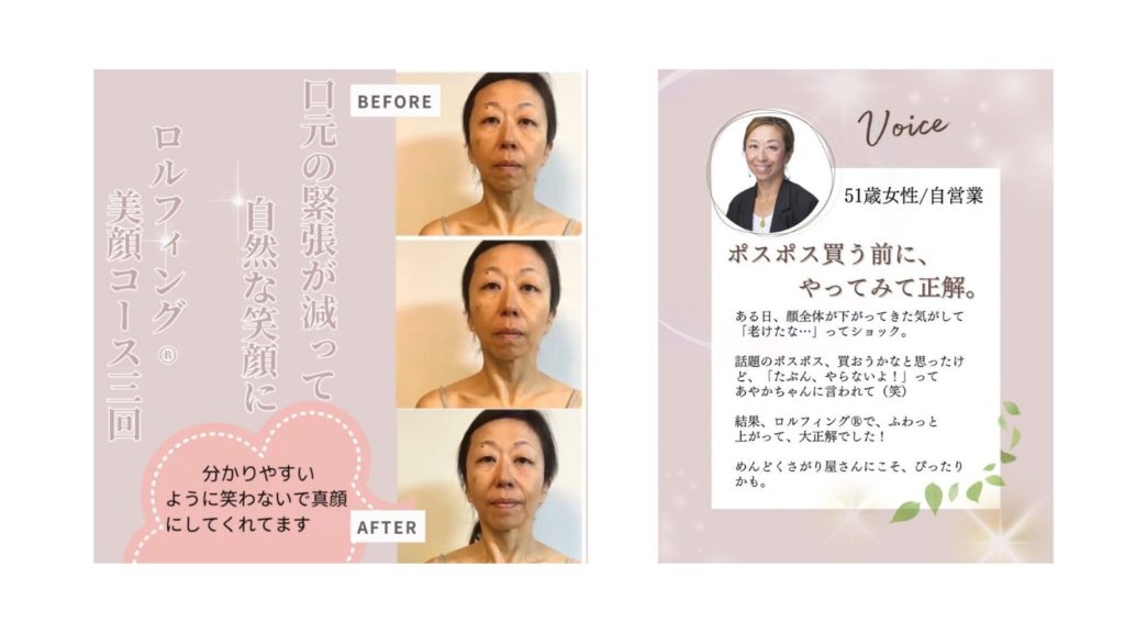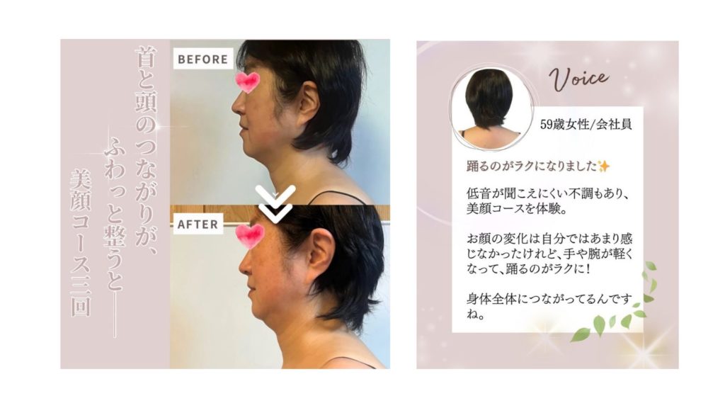 低音が聞こえにくい不調もあり、美顔コースを体験。お顔の変化は自分ではあまり感じなかったけれど、